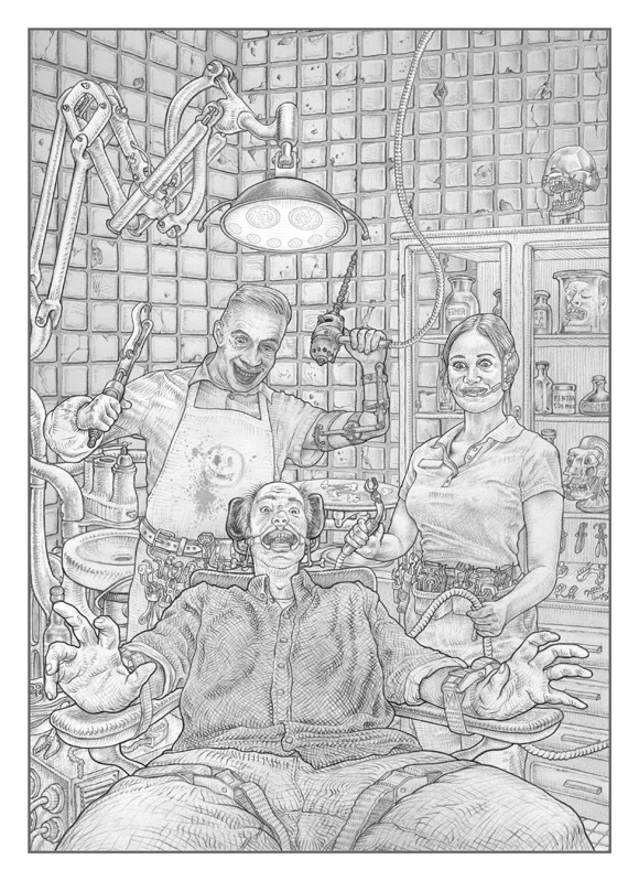Het idee voor de serie tekeningen is ontstaan toen ik ontwerpschetsen maakte voor een logo en huisstijl in opdracht van een Amerikaanse tandartspraktijk. De samenwerking verliep nogal stroef. Mijn ideeën bleken ver verwijderd van wat de opdrachtgever voor ogen had. Na een reeks aanpassingen, wat een steeds suffer ontwerp tot gevolg had, heb ik uit baldadigheid een cartoon getekend: Een vals klein mannetje met bebloed schort, in zijn ene hand een accuboormachine en in de andere een combinatietang. Het onderschrift luidde: Mr Dente, affordable dentist care…