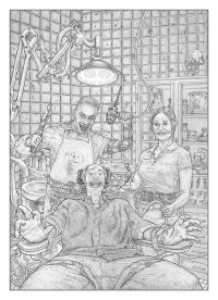 Toen drong het plots tot me door dat veel mensen de tandarts zo zien en panisch bang zijn als er iets aan hun gebit gedaan moet worden. En dat er veel méér van dit soort angsten bestaan. Angsten die verbeeld kunnen worden in fantastische tekeningen!